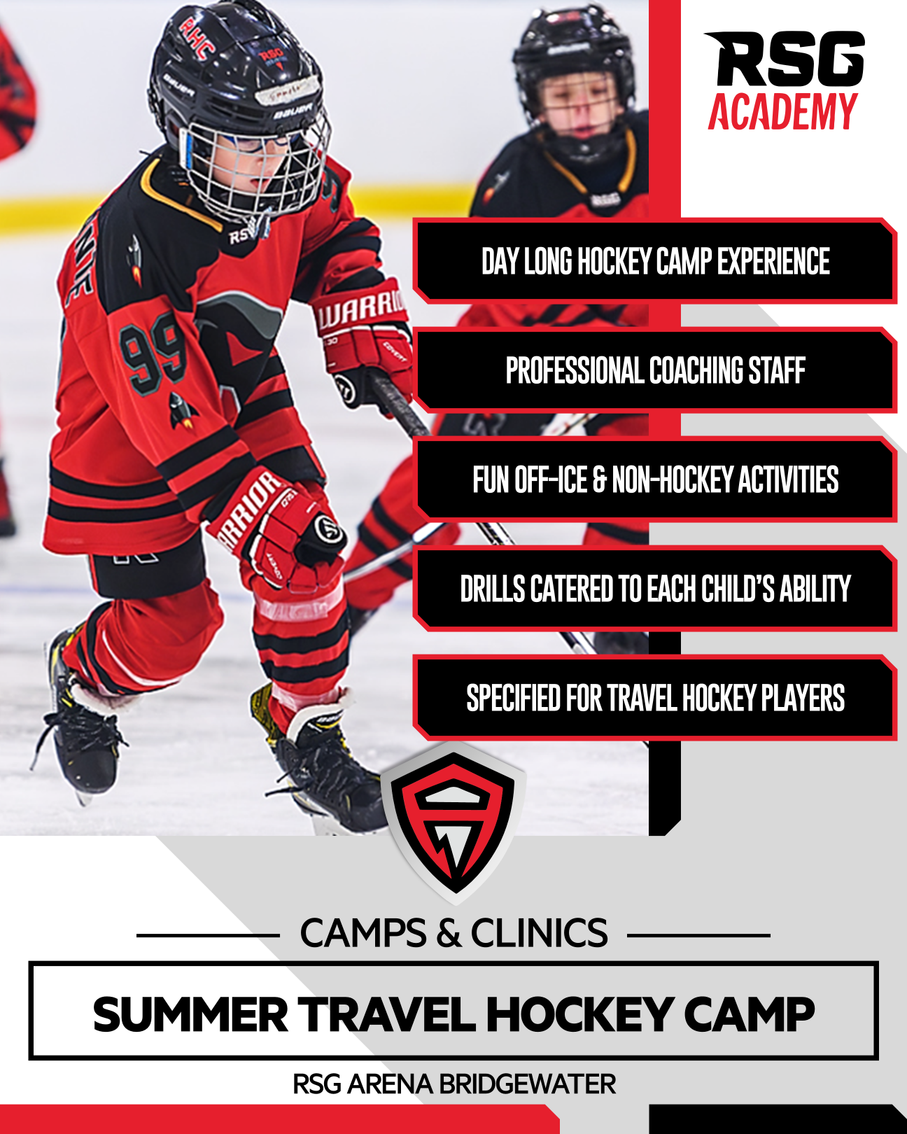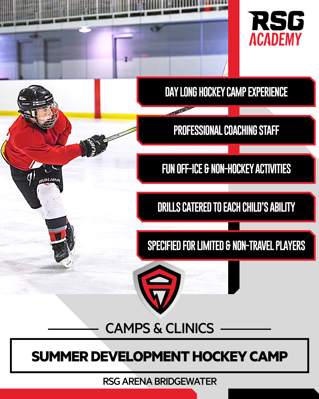 Join RSG Academy for fun-filled weeks of our summer camps at RSG Arena Bridgewater! RSG Academy offers two camps: Our Summer Development Camp for the beginner to intermediate player, and our Travel Hockey Camp for players currently playing travel. Our camps offer full day programs with a low instructor-student ratio for maximum exposure.