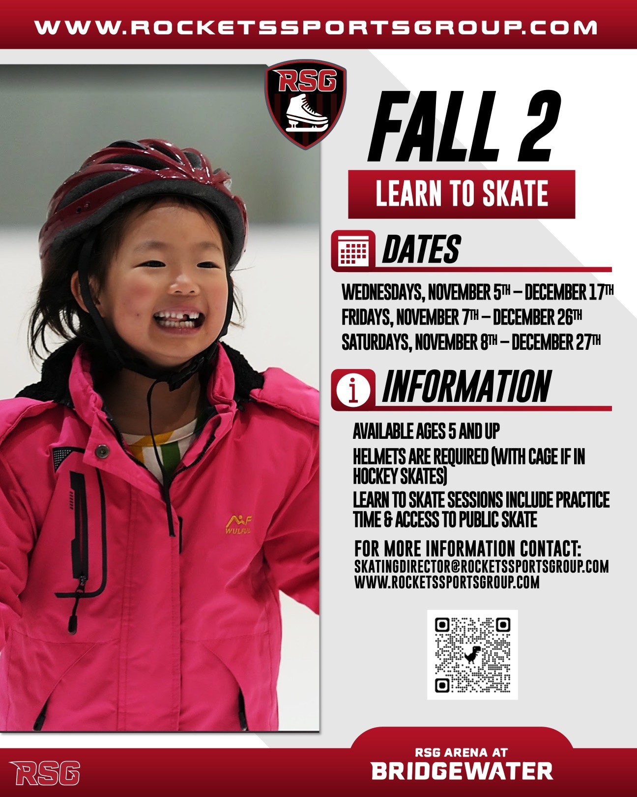 The Rockets Sports Group Learn to Skate program at Bridgewater Sports Arena utilizes the Ice Sports Industry Learn to Skate Program, which offers classes from Toddler to Adult skating instruction and Hockey Learn-to-Skate Classes!